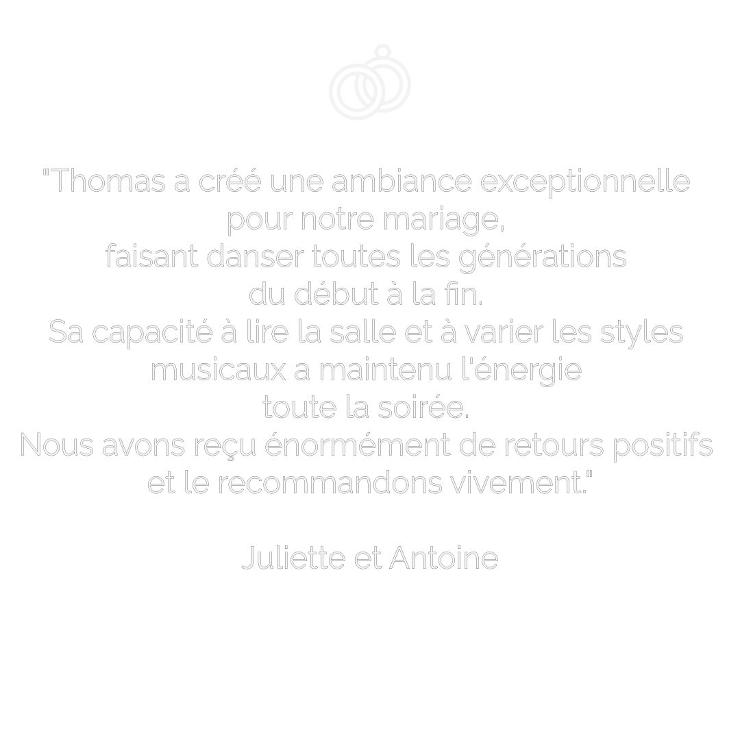 Une fête réussie est une fête qui vous ressemble, j’attache donc une importance particulière à sa préparation. Nous prenons le temps d’échanger sur son déroulé, l’ambiance que vous souhaitez créer et vos goûts musicaux.